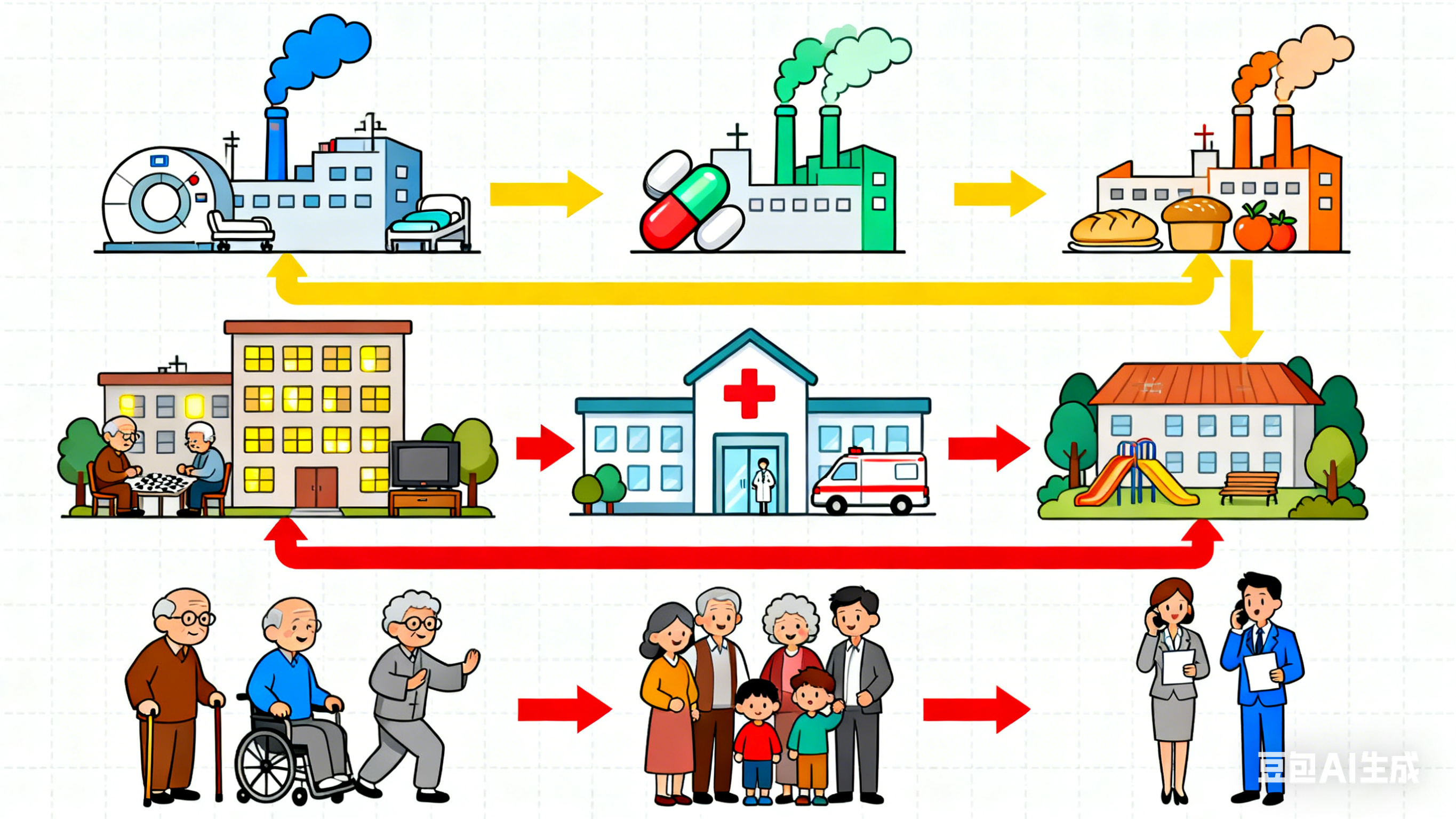 养老行业供应链远不止是商品流通,而是一个涵盖"医、食、住、行、护、乐"的全方位服务体系。上游包括医疗器械、适老产品、食品供应商;中游涵盖养老机构、护理人员、医疗机构;下游延伸至社区驿站、居家服务及终端长者家庭。这个链条长期面临资源分散、信息割裂、供需错配等痛点,导致服务质量参差不齐,运营成本居高不下。